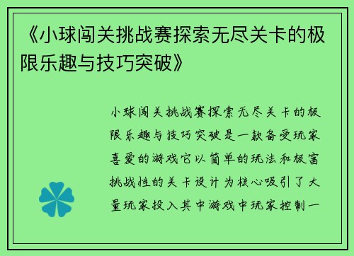 《小球闯关挑战赛探索无尽关卡的极限乐趣与技巧突破》是一款备受玩家喜爱的游戏,它以简单的玩法和极富挑战性的关卡设计为核心,吸引了大量玩家投入其中。游戏中,玩家控制一颗小球在充满障碍和陷阱的关卡中前进,目标是通过层层关卡的挑战,最终突破极限、解锁更高难度的内容。本文将从游戏的极限乐趣、技巧突破、关卡设计和玩家心态四个方面进行详细阐述,带领读者深入探索《小球闯关挑战赛》中的独特魅力。无论是对游戏的设计思路、玩家的应对策略,还是游戏带来的成就感,都将有充分的探讨。最终,我们将对游戏的体验进行总结,看看它是如何将简单的玩法与复杂的挑战巧妙融合,从而为玩家带来持久的游戏乐趣。